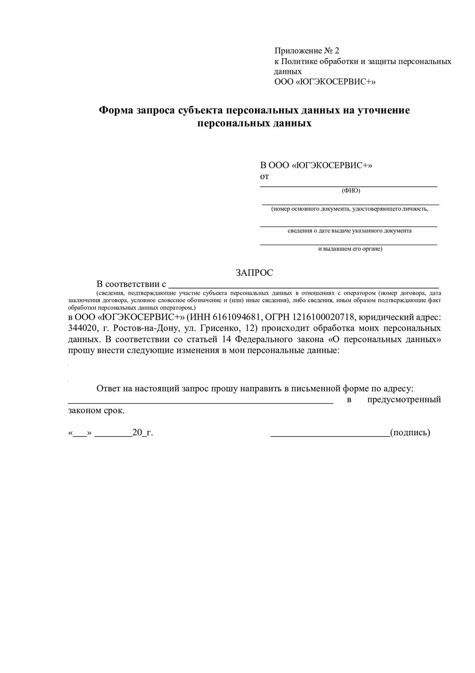 6.9. Для уточнения определенных персональных данных Субъекту (либо законному представителю) необходимо заполнить соответствующую форму запроса субъекта персональных данных на уточнение персональных данных (приложение 2 или 6) и передать лично работникам ООО «ЮГЭКОСЕРВИС+», принимающим обращения граждан, либо по почте.