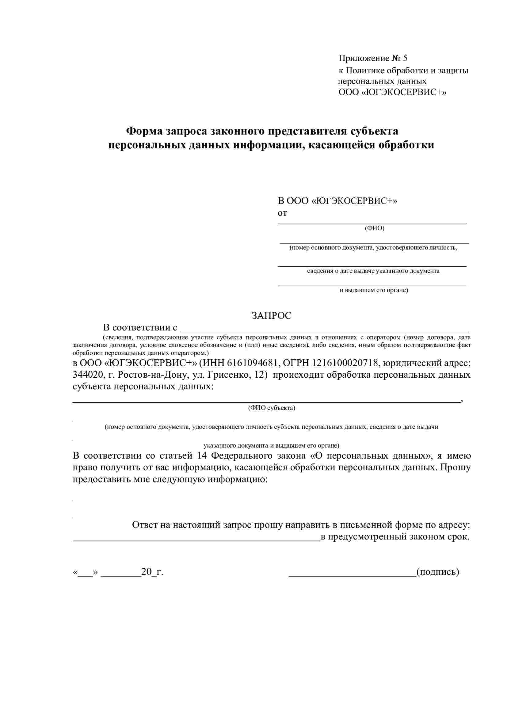 6.8. Для получения необходимой информации, касающейся обработки персональных данных, описанной в пункте 6.5.1. настоящей Политики, Субъекту (либо законному представителю) необходимо заполнить соответствующую форму запроса субъекта персональных данных информации, касающейся обработки персональных данных (приложение 1 или 5) и передать лично работникам ООО «ЮГЭКОСЕРВИС+», принимающим обращения граждан, либо по почте.